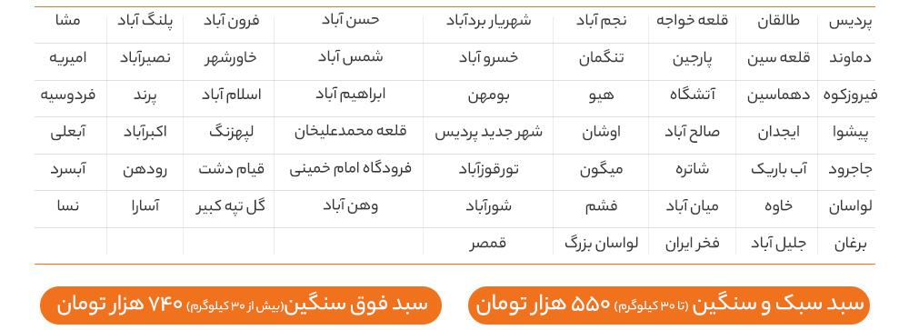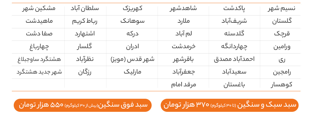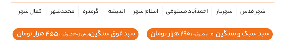 ارسال برای شهرهای اطراف استان تهران و البرز (شهرهای مانند دماوند ، لواسان ، ورامین ، هشتگرد و …) توسط پیک های ارسال بار (مانند اسنپ پیک) انجام میشود.