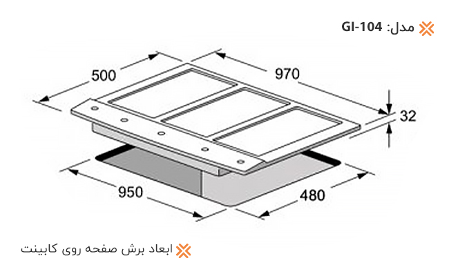 - سایز اجاق گاز: طول: 97 سانتی متر عرض: 50 سانتی متر