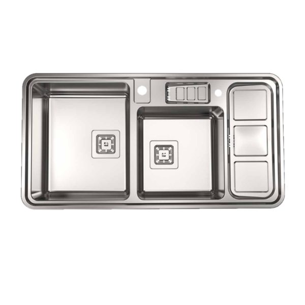 سینک ظرفشویی استیل البرز مدل 853 توکار با طول ۱۰۰ سانتی متر و عرض ۵۲ سانتی متر دارای دو لگن بزرگ و یک سینی کوچک است و همراه با جا مایع ارائه میشود. ضخامت ورق این سینک 0.8 سانتی متر است و امکان نصب شیر ظرفشویی با وزن بالا را دارد. تفاوت این مدل با 852 در طرح سینی است.