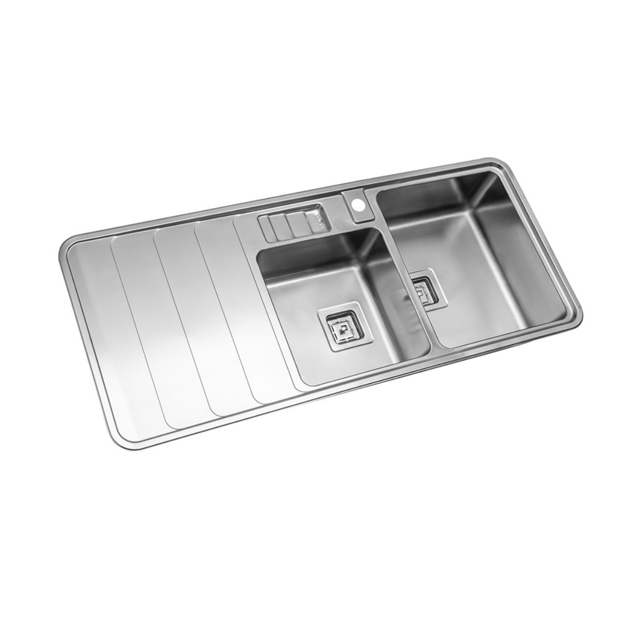 سینک ظرفشویی استیل البرز مدل 856 توکار با طول ۱۲۰ سانتی متر و عرض ۵۲ سانتی متر دارای دو لگن بزرگ و یک سینی است و بدون جامایع ارائه میشود. ضخامت ورق این سینک 0.8 سانتی متر است و امکان نصب شیر ظرفشویی با وزن بالا را دارد. این سینک دارای جای قرار دادن اسکاچ است.