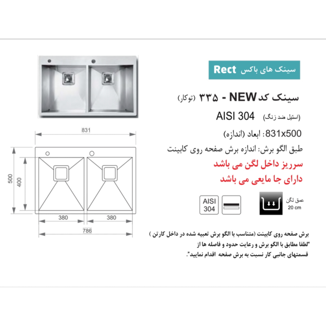 سینک ظرفشویی باکسی اخوان مدل 335 در زمستان ۱۴۰۲ توسط کارخانه به بازار ارائه شد. این سینک مشابه سینک بسیار پر فروش 334 میباشد با این تفاوت که دارای ابعاد بزرگتر (طول 83.5 سانتی متر) و لگن های بزرگتر میباشد. سینک باکسی اخوان با ضخامت ۱ میلی متر امکان نصب شیر ظرفشویی سنگین را به شما میدهد و دارای جامایع میباشد.